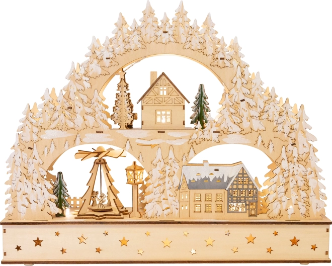Ročno izdelan videz, natančni izrezi dreves in hišk ter naravni leseni ton naredijo arko za privlačno središče božične dekoracije tako na oknu kot na komodi.