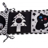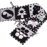 Kontrastna senzomotorična knjigica, zasnovana kot zaščita za posteljico, je popolna izbira za otroke, ki začenjajo odkrivati svet. Knjiga v obliki harmonike je lahko enostavno pritrjena na posteljico s pomočjo vrvic, kar prinaša ne le zabavo, ampak tudi varnost.