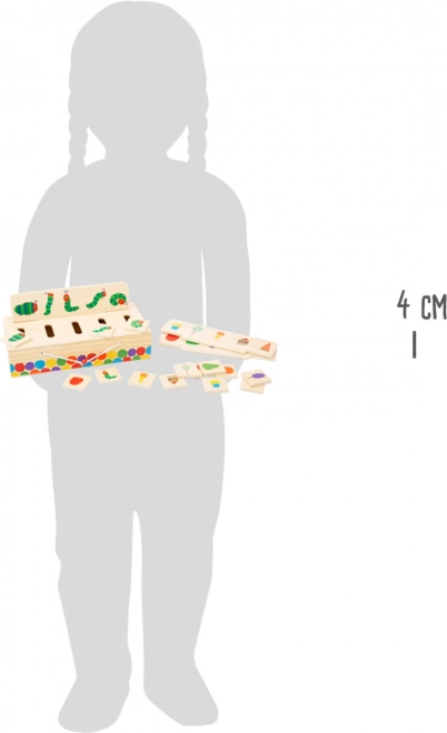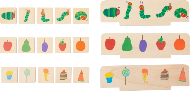 Dizajn s priljubljenim motivom Very Hungry Caterpillar otroke takoj pritegne. Ploščice in pokrov so enostavni za uporabo, trpežna lesena izdelava pa zagotavlja dolgo življenjsko dobo. Po igri vse preprosto zaprete z elastičnim trakom – nič se ne raztrese.