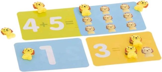 - Tehtnica v obliki leva, 19 malih levčkov, številke 1–10, 30 kartic z matematičnimi nalogami