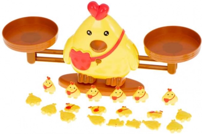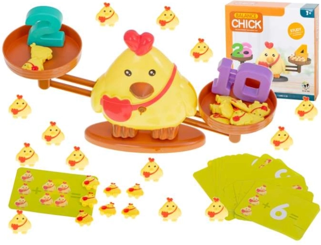 Uravnavanje številk in piščančkov otrokom vizualno prikazuje principe seštevanja in odštevanja. Vsak piščanček ima maso številke 1, zato je računanje jasno in intuitivno.