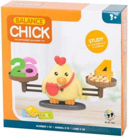 - Vsebina kompleta: tehtnica v obliki piščančka, 19 piščančkov, številke 1–10, 30 kartic z nalogami