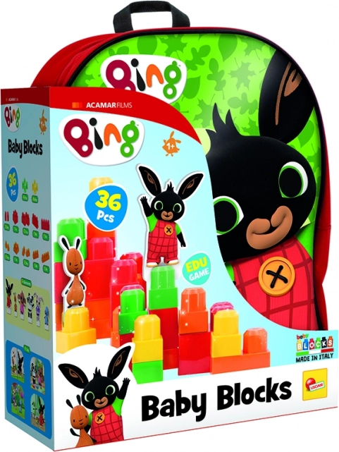 Nahrbtnik s priljubljenim otroškim junakom Bingom. V nahrbtniku so kocke Baby Blocks za najmlajše in kartice likov iz priljubljene otroške serije. Priporočena starost od 1 leta.