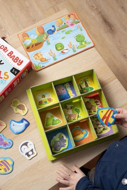 Montessori škatlica Živali otrokom prinaša pisan svet narave skozi preprosto razvrščanje in povezovanje. Otroci se učijo razlikovati živali in njihovo naravno okolje, razvijajo logično mišljenje ter koordinacijo oko–roka. Zaradi barvite in intuitivne zasnove si igro hitro osvojijo tudi najmlajši.