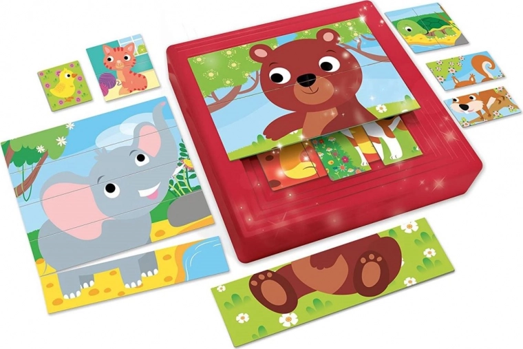 Progresivni puzzle mladiči 8 v 1 LISCIANI navdušijo s čudovitimi ilustracijami in pametnim sistemom sestavljanja. Set vsebuje kvadratno plastično škatlico z devetimi ravnmi okvirjev, s katerimi otroci sestavljajo slike korak za korakom, od najlažje do najzahtevnejše. Koščki so ravni, brez klasičnih puzzle zatičev, kar olajša rokovanje tudi čisto najmlajšim.