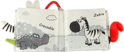 Prvo branje za vašega dojenčka: mehka senzorična knjižica s kontrastnimi slikami živali in praktično sponko za voziček. Vsebuje šumeče strani, všito ropotuljico, piskalico in različne teksture za razvoj vida, sluha in tipa. Primerno od 6 mesecev.