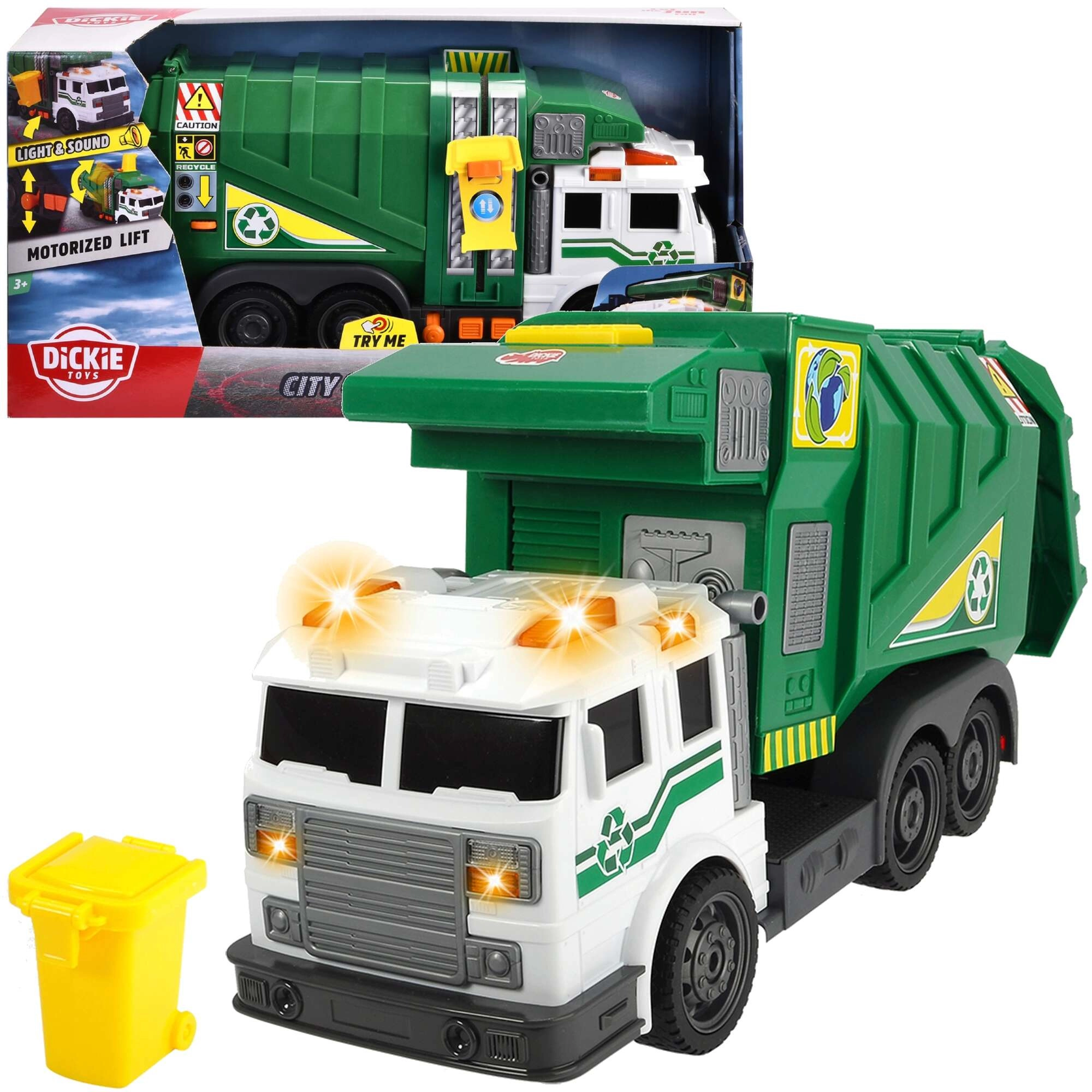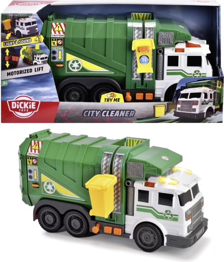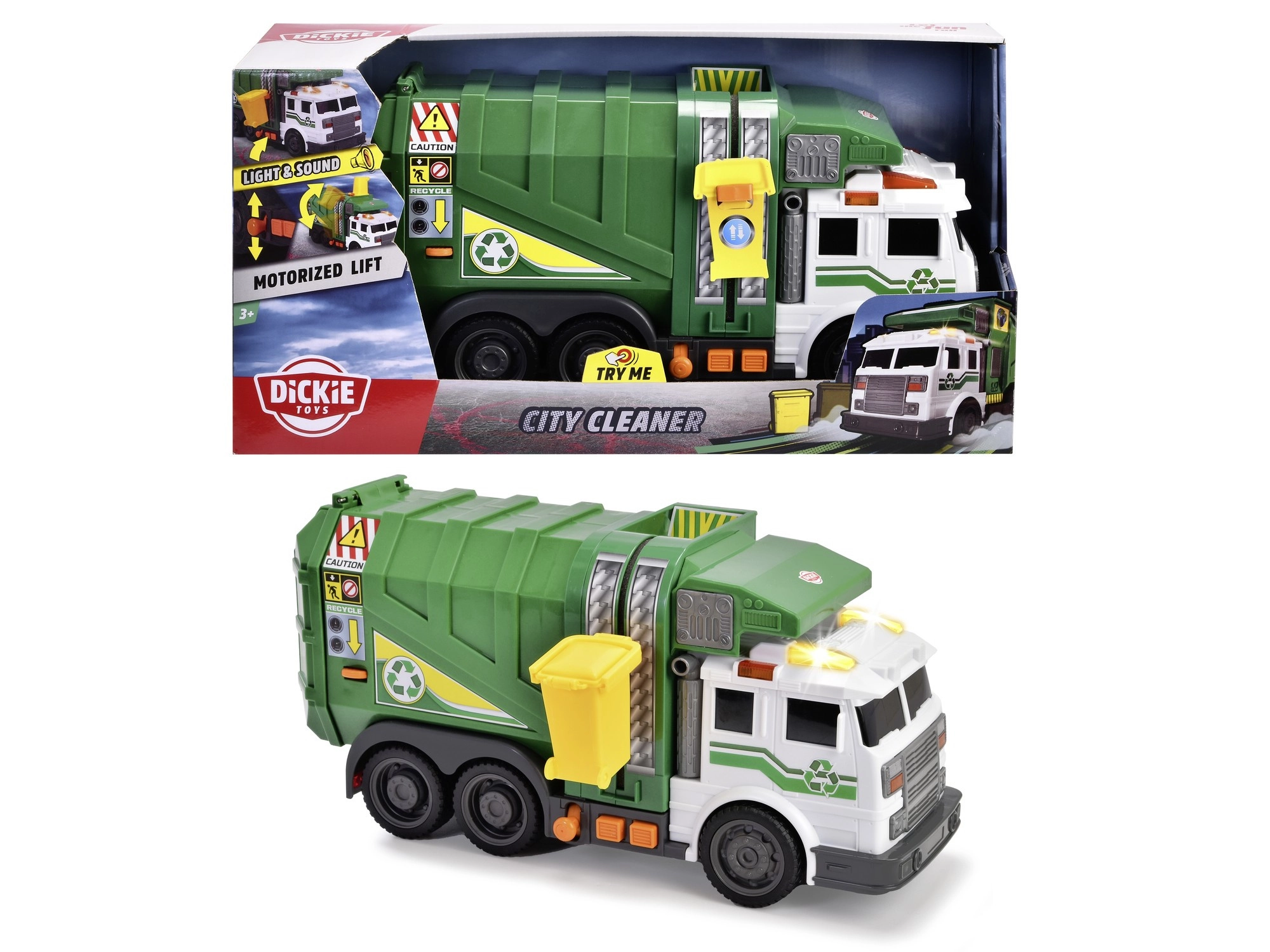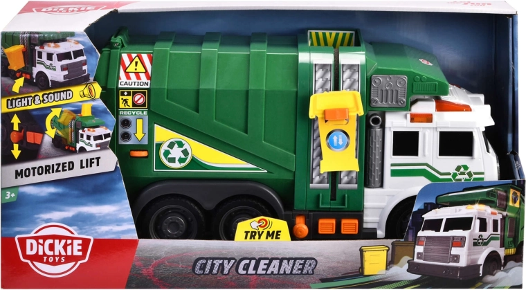 Realističen zeleni smetarski tovornjak City Cleaner znamke Dickie Toys navduši otroke s svetlobnimi in zvočnimi učinki, funkcionalnim dvigalom za rumen zabojnik in gibljivimi deli. Odlična igrača za igranje odvoza odpadkov, učenje o recikliranju in razvoj finih motoričnih spretnosti.