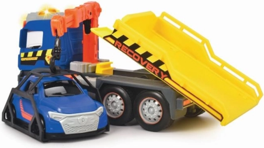 Otroci lahko dvigujejo, nakladajo in fiksirajo vozila s pomočjo premičnega žerjava in nagibne rampe z napisom RECOVERY.