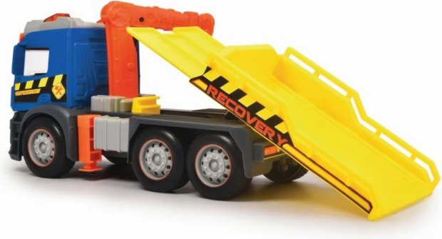 Odkrijte realistično vlečno vozilo MERCEDES dolžine 26 cm z frikcijskim pogonom, lučmi in zvoki. Prozorna okna razkrivajo podrobnosti notranjosti, premični podajalnik in nagibna tovorna platforma pa zagotavljata dinamično igro. Priloženo je tudi dodatno vozilo za odvoz ter funkcija Try Me za takojšnje preizkušanje.