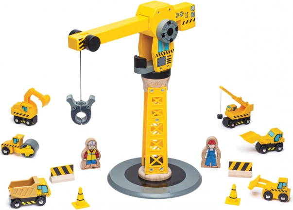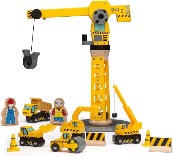 Ta kakovosten leseni gradbeni set z vrtljivim žerjavom in magnetnim kavljem prinaša otrokom neskončne možnosti igre. Zaradi robustne izdelave in varnih materialov je idealen za vsakodnevno igranje in razvoj veščin. Živahna rumena barva gradbenih vozil otroke takoj pritegne.