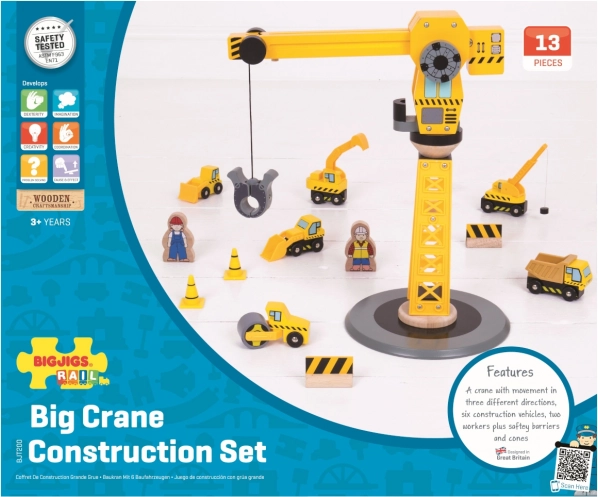 Set odlično dopolni otroške sobe in lesene vlakovne proge – je združljiv s priljubljenimi sistemi. Otroci lahko nakladajo in razkladajo tovor, vozijo buldožer, kiparja ali valjar, urejajo promet s stožci in zaporami ter ustvarjajo lastne zgodbe z gradbišča.