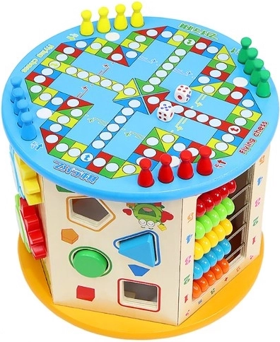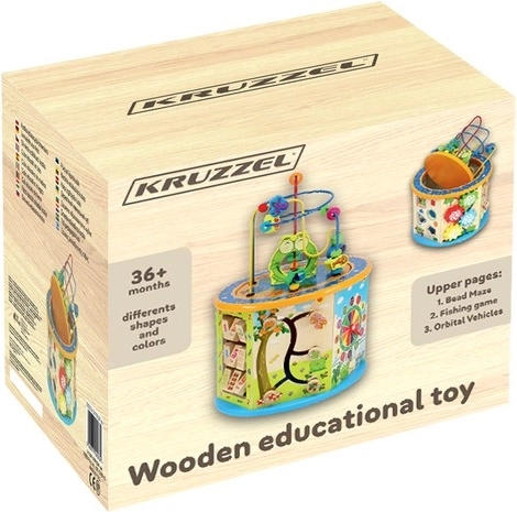 Zgornji del s koralnim labirintom je odličen za vadbo prijema in fine motorike, stranske plošče pa ponujajo vstavljanko oblik, zobnike, računalo, številke, labirint in druge aktivnosti. Spodnja stran skriva namizno igro »Človek, ne jezi se« s figurami in kockami v pakiranju – idealno za skupno družinsko zabavo.