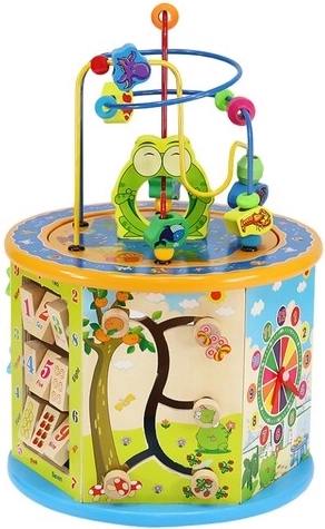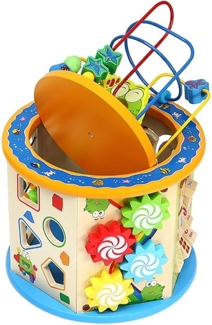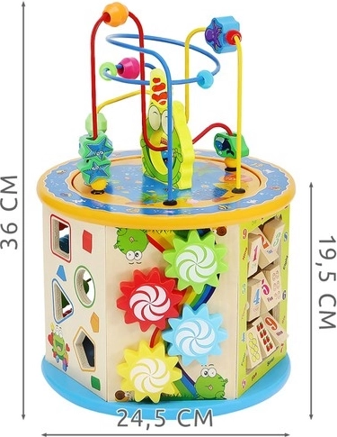 Kroglični labirint, vstavljanka oblik, zobniki, računalo, številke, ura, labirint in igralni panel – vse v eni stabilni kocki.