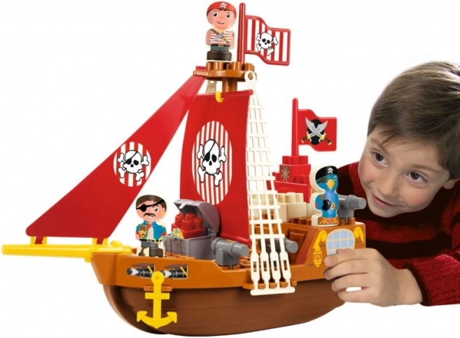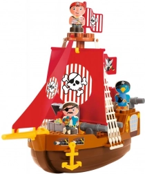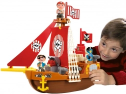 Ladja je opremljena s podrobnimi elementi, kot so rdeča jadra z motivom lobanje in prekrižanih kosti, ki otrokom zagotavljajo pristno piratsko doživetje.