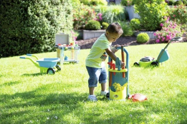 Zahvaljujoč kolesom in ročaju lahko otroci zlahka prepeljejo vso opremo tja, kjer je trenutno potrebna – na vrt, dvorišče ali igrišče.