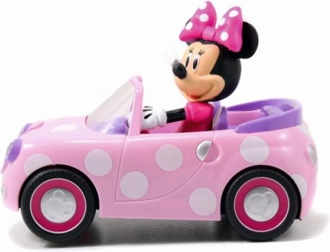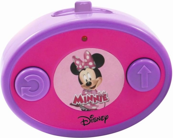 RC avtomobilček z Disneyjevo Minnie, 1-kanalni, frekvenca 2,4 GHz, vozi naravnost naprej in vzvratno. V rožnati barvi. Dolžina 19 cm.