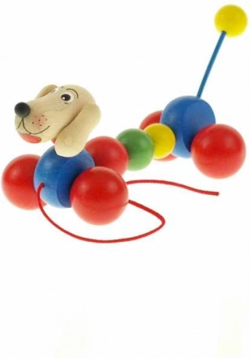 Vesel leseni kužek, ki med premikanjem maha z repom, bo razveselil otroke vseh starosti. Izdelan je iz kakovostnega lesa in ima pisano, barvito zasnovo.