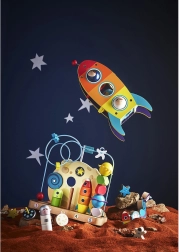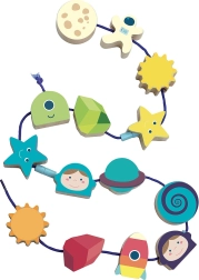 Čudovita vesoljska vlekalna igrača, odlična za razvoj fine motorike pri otrocih. Vsebuje 14 čudovito ilustriranih lesenih kroglic, kot so astronavt, luna, sonce in raketa.