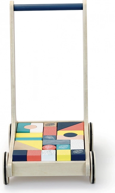 24 kock različnih oblik je priloženih vozičku, kar otrokom ponuja nešteto možnosti za ustvarjalno igro. Voziček ima modernega dizajna z modrim držalom in belimi ilustracijami.