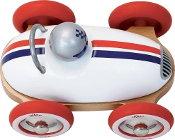 Otrokom privoščite klasično igračo z brezčasnim šarmom. Leseni Roadster znamke VILAC združuje kakovosten lakiran les in kovino z gumiranimi kolesi, ki omogočajo tiho in gladko vožnjo tako po tleh kot po preprogi. Elegantno belo ohišje z modro-rdečimi črtami in stilizirana figurica voznika poudarjata avtentičen dirkaški videz.
