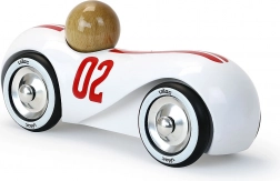 Elegantni beli dirkalni avto iz lakiranega lesa s kovinskimi, gumiranimi kolesi je idealen za male dirkače in kot dizajnerska dekoracija. Z izdelavo v Franciji ponuja gladko vožnjo, vzdržljivo izvedbo in brezčasen vintage dizajn.