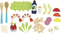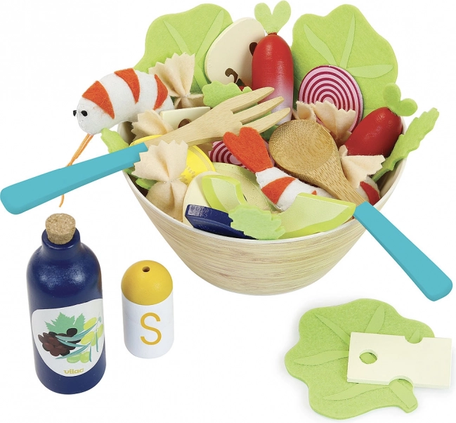 Doživite z otroki veselje lastne kuhinje s tem izjemnim kompletom za pripravo solate. Ta inovativna igrača vključuje bambusovo posodo, lesene in filc izdelke, ki posnemajo pravo hrano, ter spodbuja otrokovo kreativnost in domišljijo.