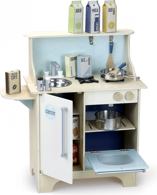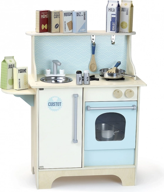 Vilac lesena kuhinjica Cuistot v modri barvi z dodatki, koritom, pečico in klikečimi gumbi. Trdna konstrukcija, idealno od 3 let.