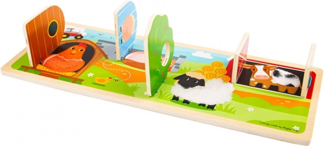 Senzorična sestavljanka s kmečkim motivom otrokom prinaša bogat svet oblik, barv in tekstur. Odpirajoča se vratca in tipni elementi vabijo k raziskovanju, postavljanju vprašanj in pripovedovanju zgodb. Otroci na igriv način vadijo prepoznavanje živali, vizualno zaznavanje in tipne spretnosti.