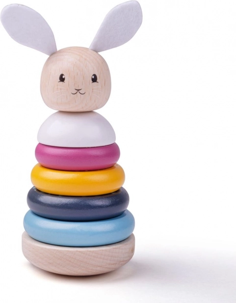 Ta kakovostna lesena zložljivka v pastelnih barvah je idealna prva izobraževalna igrača. Otroci zlagajo obročke od največjega do najmanjšega, krepijo koordinacijo oko–roka ter se učijo razlikovati barve in oblike. Tekstilni ušeski in repek zajčka dodajajo tipno razsežnost igre.