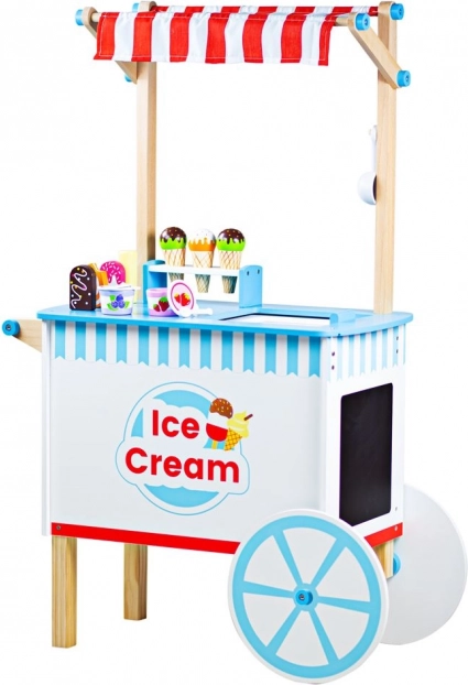 Leseni voziček za sladoled BIGJIGS TOYS spremeni otroško sobo v barvito stojnico, polno dobrot. Otroci lahko strežejo kepice, ponujajo lučke ter vadijo vljudnost in besedni zaklad. Stabilna konstrukcija, privlačna zasnova in bogati dodatki vabijo k dolgi in smiselni igri.