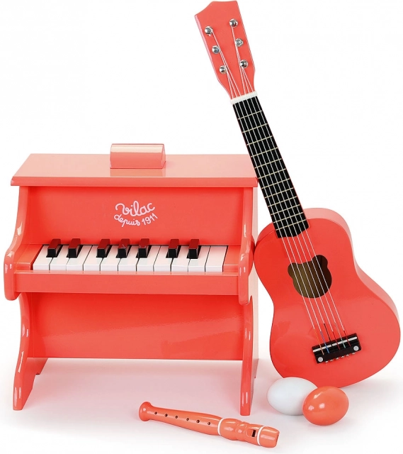 Otroška kitara VILAC v živahno oranžni barvi je idealna za prve glasbene korake. Ponuja kakovostno izdelavo, 6 najlonskih strun in dodatke v obliki rezervne strune in trzalice. Odlično za razvoj ljubezni do glasbe in ritma pri otrocih od 3 let. Opozorilo: gre za posnetek, ne za polno vreden glasbeni instrument.