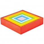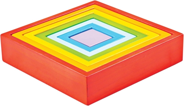 Mavrična paleta in postopno manjšajoči se kvadrati spodbujajo otroke k razlikovanju barv, velikosti in oblik. Idealno za prve korake v razvrščanju in poimenovanju.