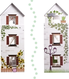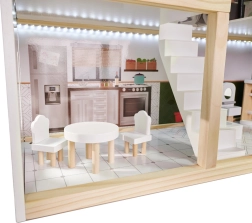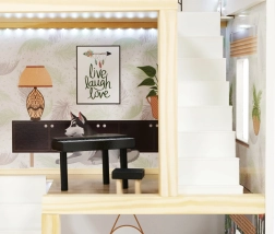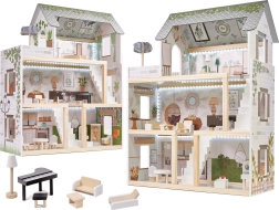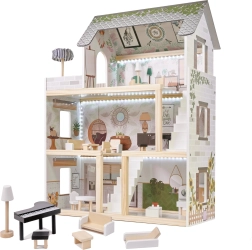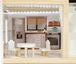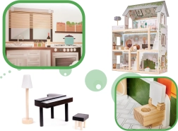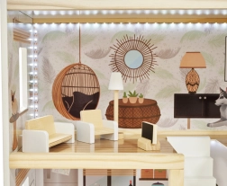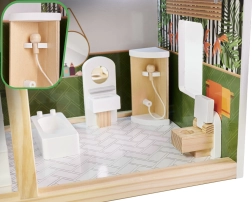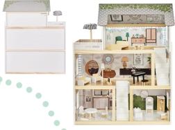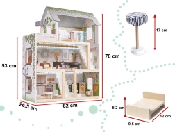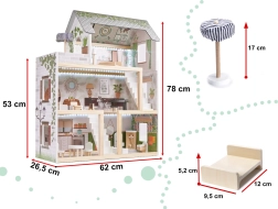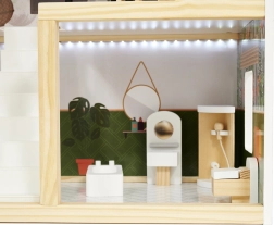 Lesena hiška za punčke LULILO Floro je zasnovana v boho slogu, kar jo naredi ne le lepo, temveč tudi funkcionalno. S tremi nadstropji in prostorno teraso ponuja veliko prostora za različne scenarije in igre. Hiška je opremljena s štirimi prostori: kuhinjo, kopalnico, dnevno sobo in spalnico, pri čemer je vsak prostor bogato opremljen kot v pravem domu.