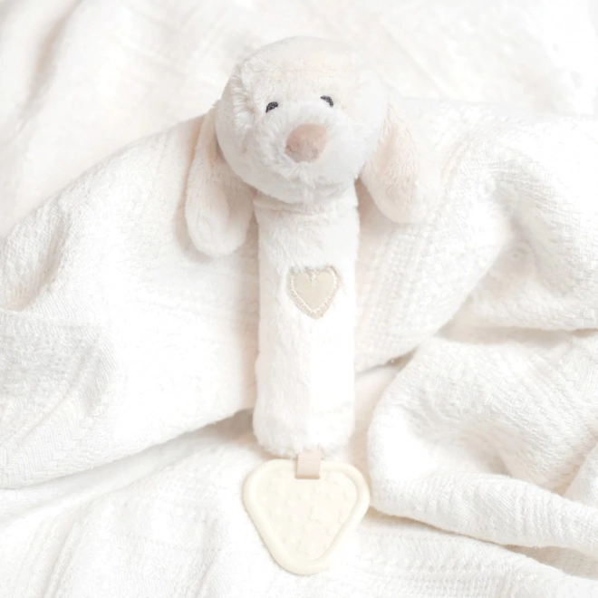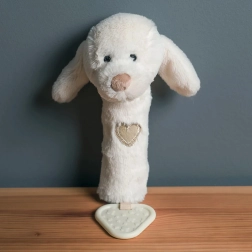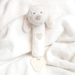 Ta vsestranska mehka igračka v podobi kužka ponuja otrokom kar tri doživetja v enem: nežno ropotanje za spodbudo sluha, zabavno piskanje ob stisku in teksturirano grizalo za olajšanje ob izraščanju zobkov. Nevtralen naravni ton se poda k vsaki opremi za dojenčka.