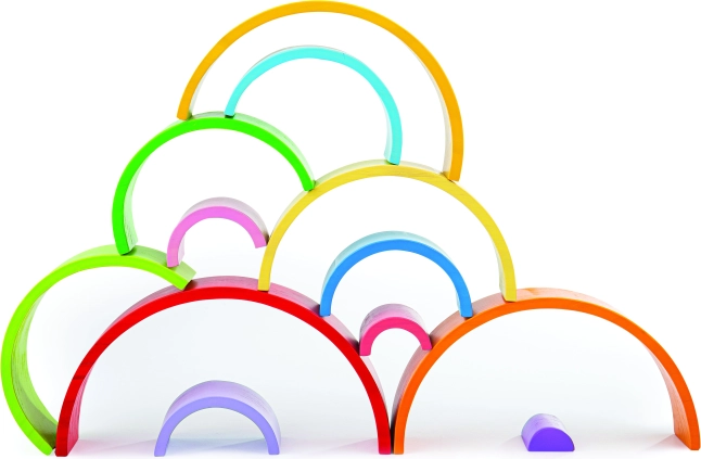 Velika lesena mavrica je brezčasna izobraževalna igrača, ki podpira odprto igro brez pravil. Otroci lahko loke zlagajo, plastijo, povezujejo in kombinirajo z drugimi gradbenimi kompleti – možnosti so praktično neskončne. Zahvaljujoč robustni izvedbi in gladki površini je rokovanje prijetno, mavrica pa prenese vsakodnevno igro.