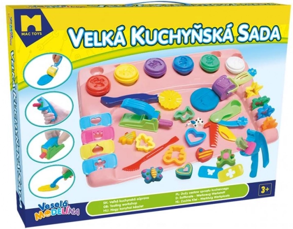 Odkrijte ustvarjalni svet z otroškim kompletom Modelo – velika kuhinjska set s podlogo in 31 kosi dodatkov, dopolnjena s 6 lončki plastelina v osnovnih barvah. Otroci lahko režejo, oblikujejo in okrasijo svoje stvaritve, medtem ko podloga ščiti mizo in ohranja red. Odlično za razvoj fine motorike, ustvarjalnosti in domišljije.