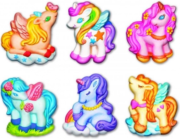 Ustvarite in pobarvajte bleščeče mavčne magnetke za hladilnik ali broške v obliki 6 prikupnih samorogov. Idealen za razvoj ustvarjalnosti otrok.