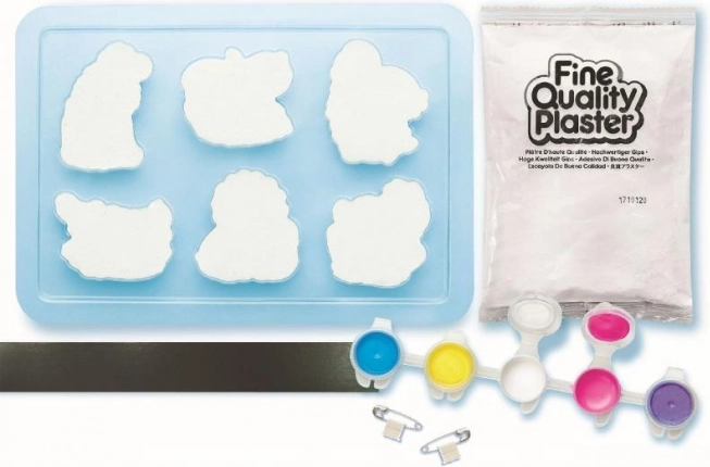 Komplet vsebuje materiale za izdelavo mavčnih odlitkov, ki jih lahko otroci nato sami pobarvajo. Vsebuje pladenj s plastičnimi kalupi in kakovosten mavčni prah.