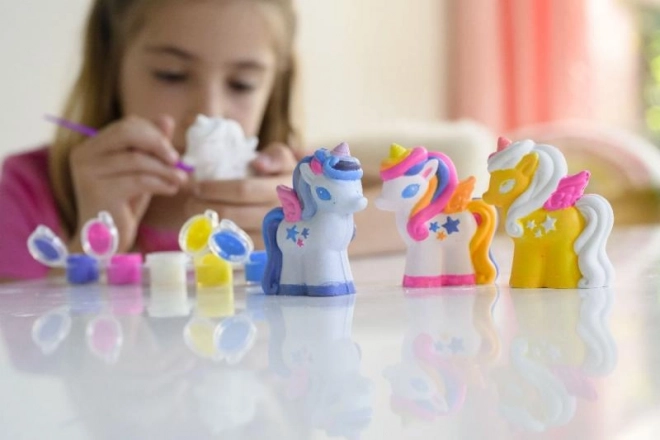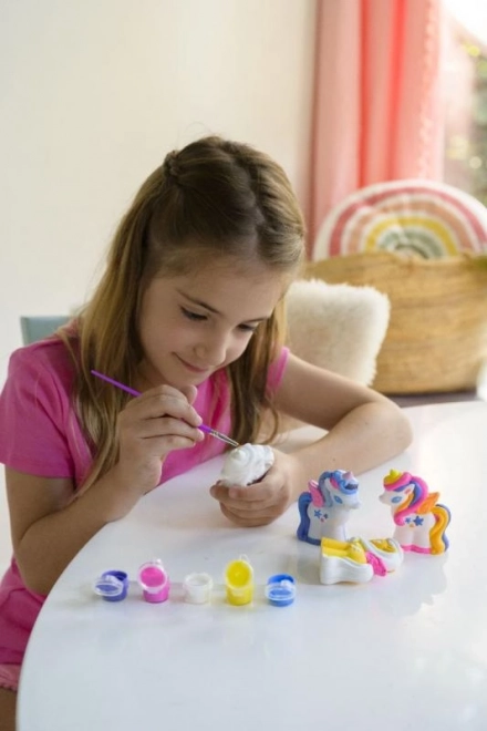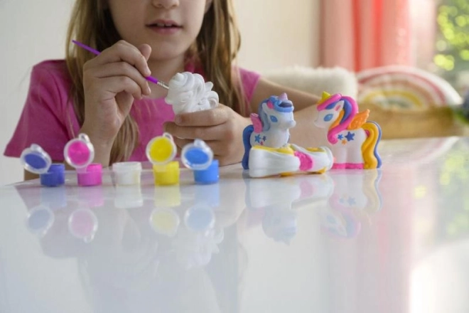 Spremeni mavčne odlitke v barvite, bleščeče samoroge. V setu najdeš forme, mavec, barve in čopič – dodati moraš le ideje. Preprost postopek korak za korakom je idealen za začetnike.