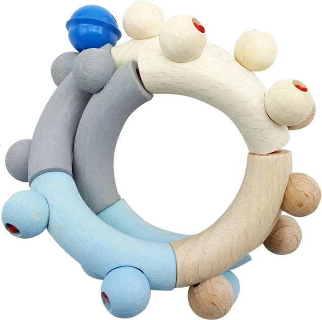 Visokokakovostna lesena ropotuljica, idealna za spodbujanje domišljije in razvoj fine motorike otroka. Ropotuljica navduši s svojimi pastelnimi barvami in je etično izdelana iz trajnostno upravljanih gozdov.