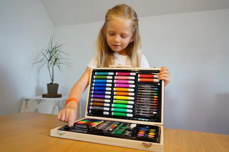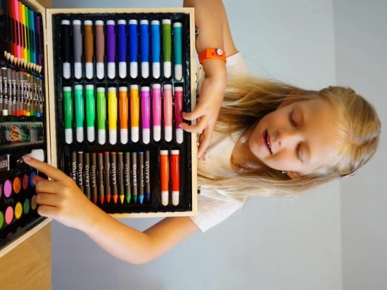 Umetniški lesen kovček, ki bo navdušil vse slikarje in ustvarjalne ljudi. Kovček vsebuje 86 kosov. Flomastri, barvice, vodene barve, voščenke, svinčniki, ravnilo, radirka...