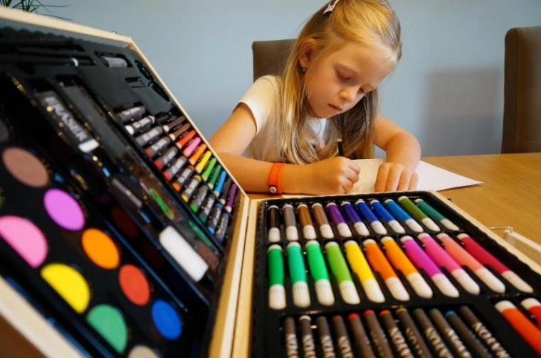 Umetniški set v lesenem kovčku barvice, pastelne svinčnike, barve