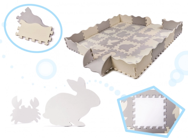 Mehka otroška podloga iz penastih sestavljank z odstranljivimi oblikami ustvari varen in ustvarjalen prostor za igro. Zahvaljujoč zvišanim robovom lahko sestavite ograjen prostor, ki zadrži igrače v notranjosti. Podloga je vodoodporna, ima proti-zdrsno površino in odlično blaži udarce, zato je idealna za prve korake. Nevtralna barva siva in ecru se poda v vsak interier.