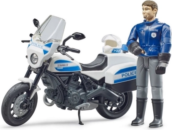 Policijski motor DUCATI Scrambler znamke Bruder je dovršen model za male in velike ljubitelje reševalnih služb. Motor ima vrtljivo krmilo za enostavno manevriranje in zložljivo stojalo za stabilno postavitev. Figurica policista ima premične okončine, zato jo je mogoče namestiti v vozni položaj ali postaviti ob vozilo.