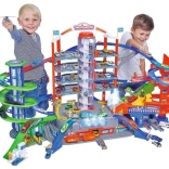 Velika igralna garaža s skoraj 1,30 m širine je največji nov izdelek v svetu Majorette! Garaža je sestavljena iz sedmih igralnih površin in ima do 35 parkirnih in skladiščnih mest. Srce postaje je motorizirano spiralno dvigalo, ki hkrati prevaža do devet kovinskih avtomobilčkov. Ko so na vrhu, avtomatska stikala razporedijo vozila v štiri različne vozne pasove. Šest različnih svetlobnih in zvočnih efektov ter nešteto igralnih postaj, kot so železniška postaja, bencinska črpalka s točilnim avtomatom, avtoservis in avtopralnica, gasilska postaja, policijska postaja s tajnim skrivališčem ali heliport, ponujajo neomejeno zabavo. V kompletu je 6 kovinskih avtomobilčkov, baterijsko gnani vlak, avtomatska kretnica, tunel s funkcijo trka in 2 motorizirani dvigali. Helikopter ni vključen. Dimenzije po sestavi: 128 x 78 x 73 cm.