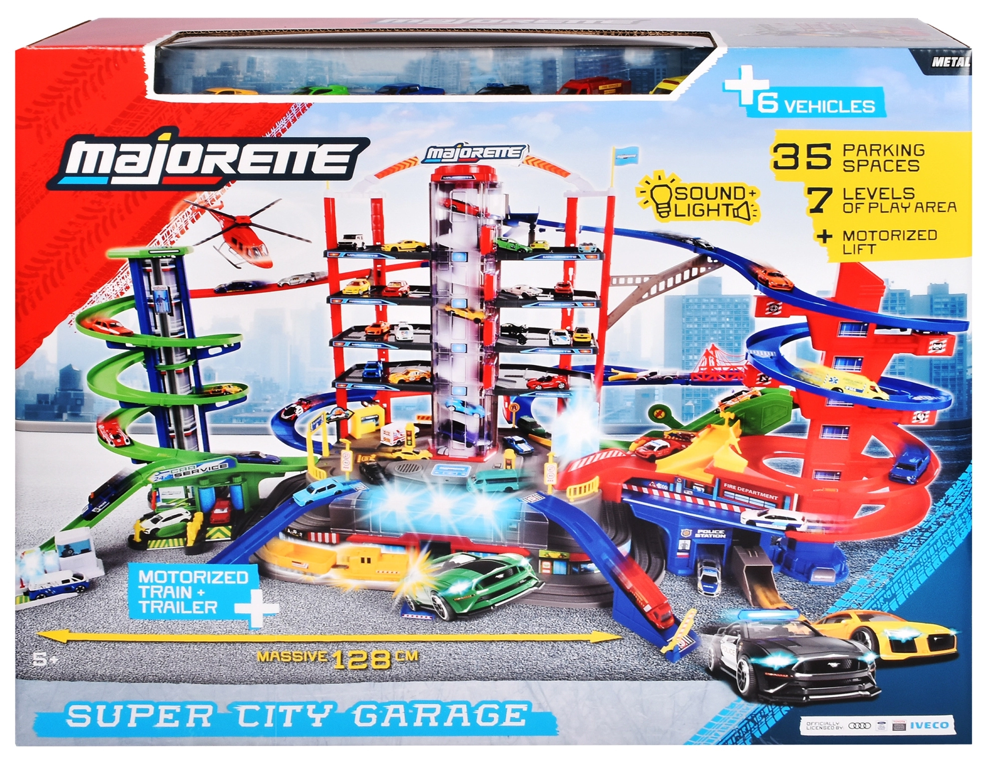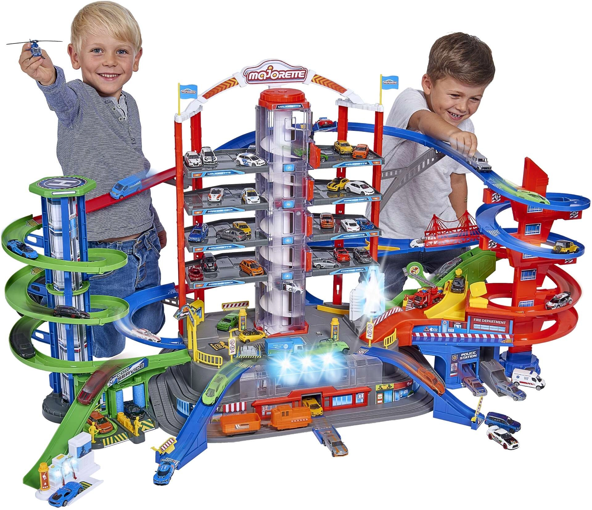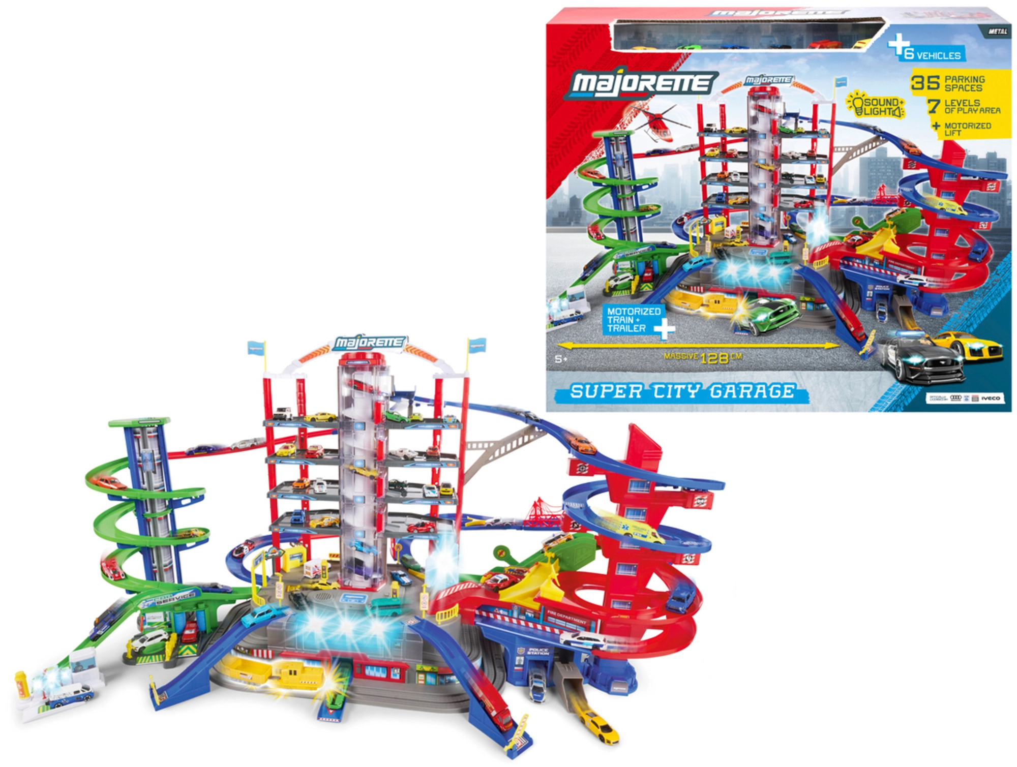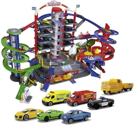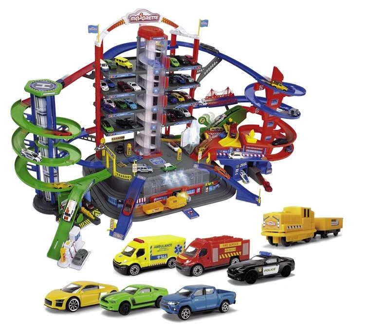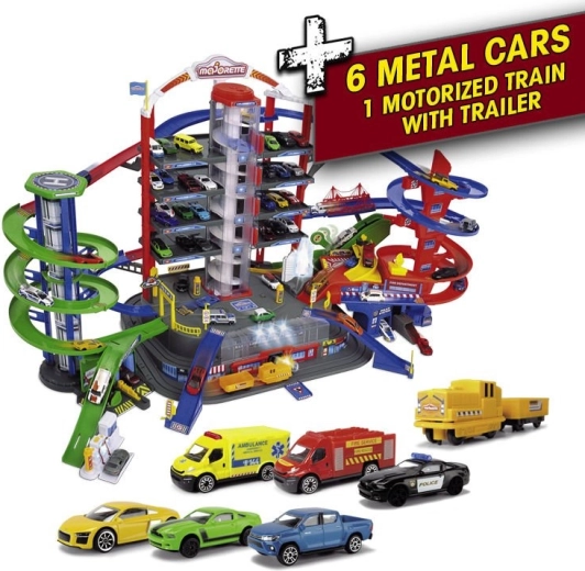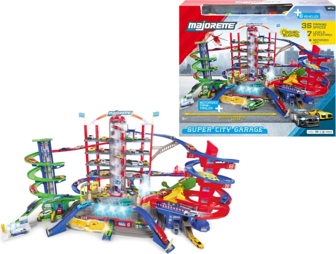 Odkrijte megaset za male voznike: 7-nadstropni garažni kompleks Super City z dvigalom, spiralnimi rampami in 6 kovinskimi avtomobilčki, dopolnjenimi z lokomotivo s svetlobnimi in zvočnimi učinki. Ne manjkajo helidrom, postaji policije in gasilcev, avtopralnica ter bencinska črpalka z zvoki in lučmi – vse za največ akcijske in ustvarjalne igre.