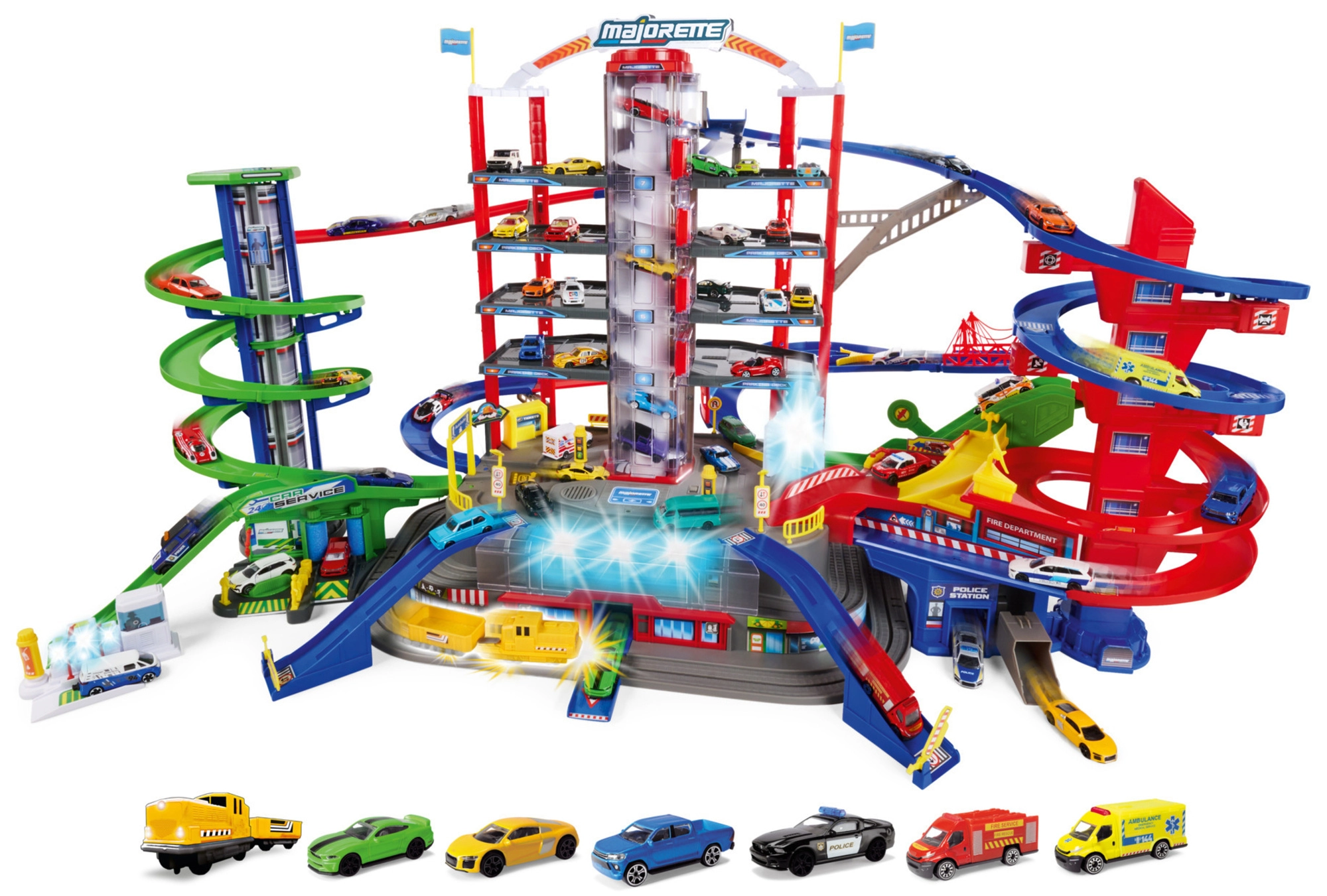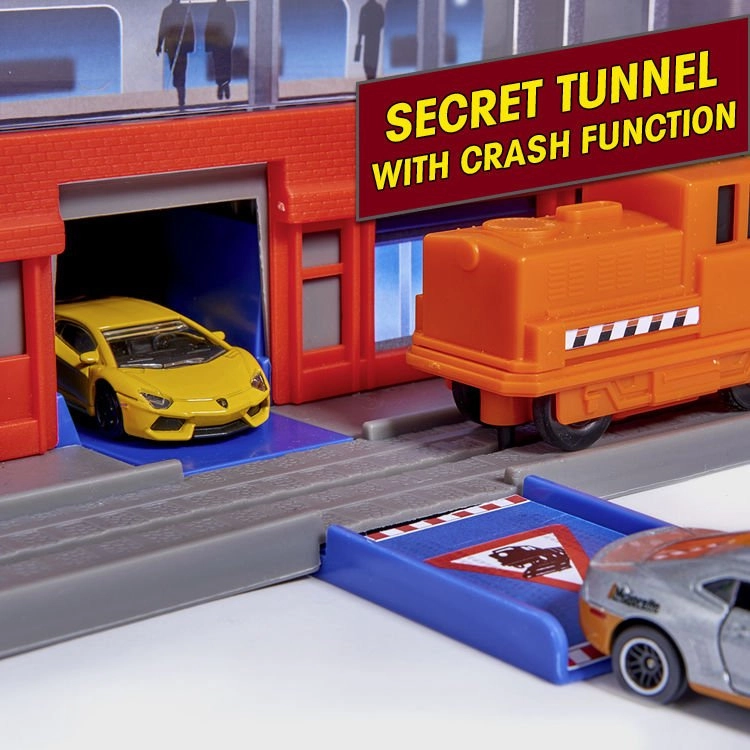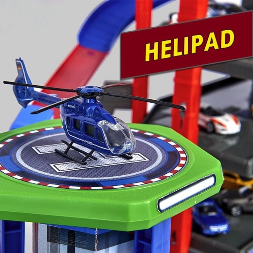 Garaža, 6 kovinskih avtomobilčkov, lokomotiva z vagonom, dvigalo, rampe, helidrom, policijska in gasilska postaja, bencinska črpalka, avtopralnica, železniška postaja, skrivni tunel