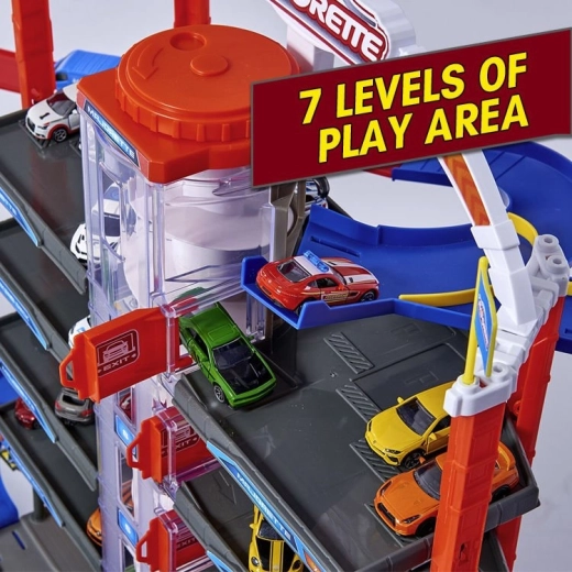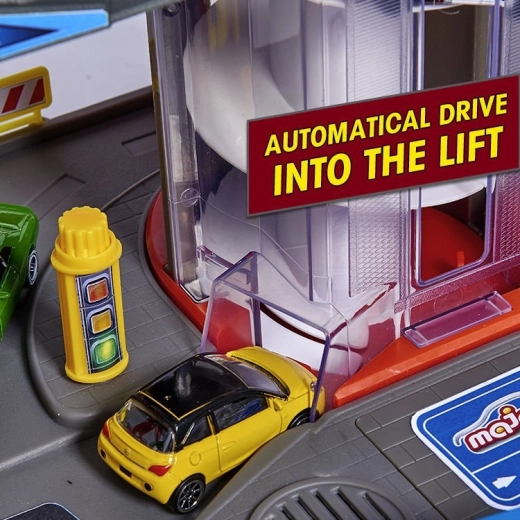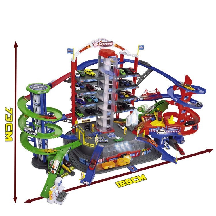 Ta velik garažni set otrokom prinaša neskončne možnosti igre na sedmih nivojih. Barvite spiralne steze, baterijsko gnano dvigalo in realistični svetlobni ter zvočni učinki bodo navdušili vsakega malega ljubitelja avtomobilov in vlakov. Kovinski avtomobilčki z prosto vrtečimi se kolesi gladko vozijo po rampah, medtem ko lokomotiva z vagonom vozi skozi skrivni tunel in se ustavlja na železniški postaji.