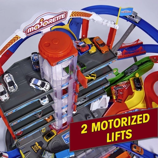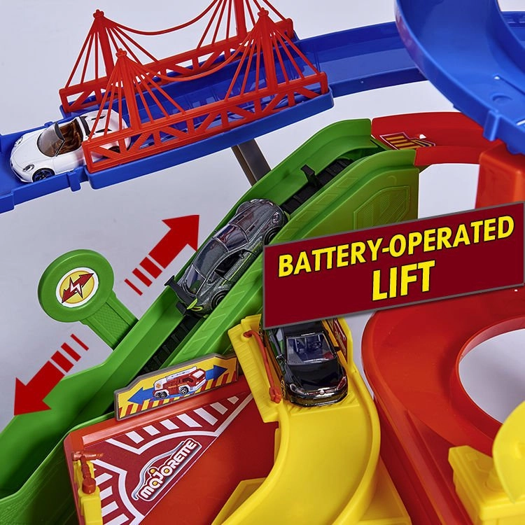 Samodejno dvigalo popelje avtomobilčke na kateri koli nivo, od koder se lahko spuščajo po barvitih spiralnih stezah.