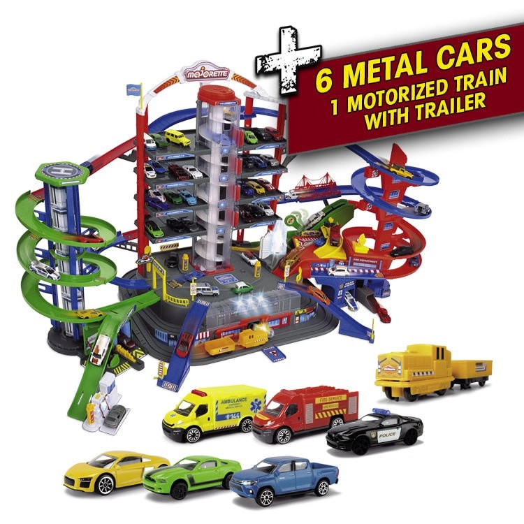 Velik garažni set Super City s 7 nivoji, 6 kovinskimi avtomobilčki in lokomotivo z lučmi in zvoki